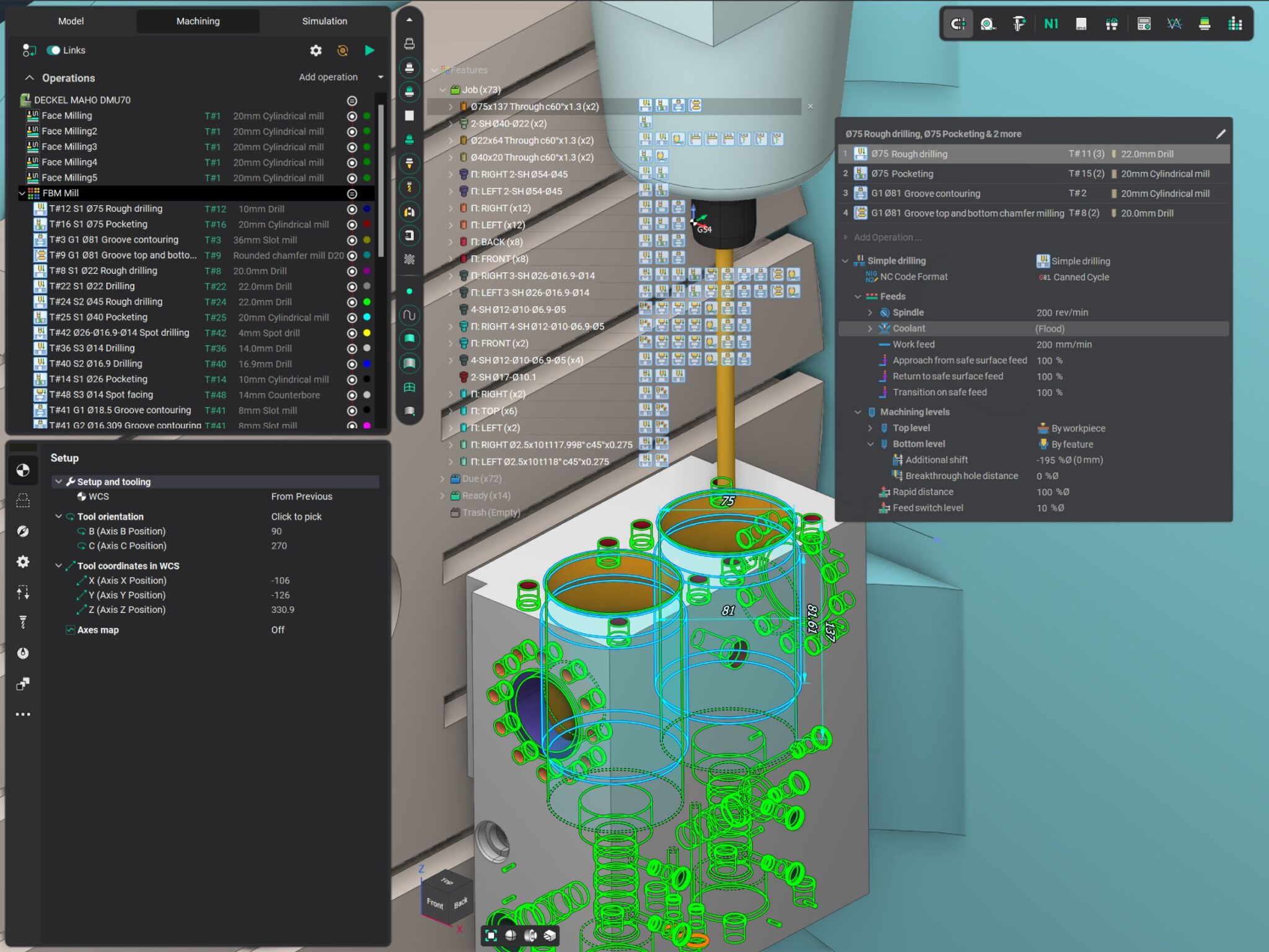 La plataforma gestiona flujos de trabajo con múltiples piezas sin problemas, reordenando automáticamente las tareas para ahorrar tiempo de máquina. También incluye verificación de código G, una vasta biblioteca de postprocesadores y simulación completa de gemelo digital para una validación precisa del mecanizado.