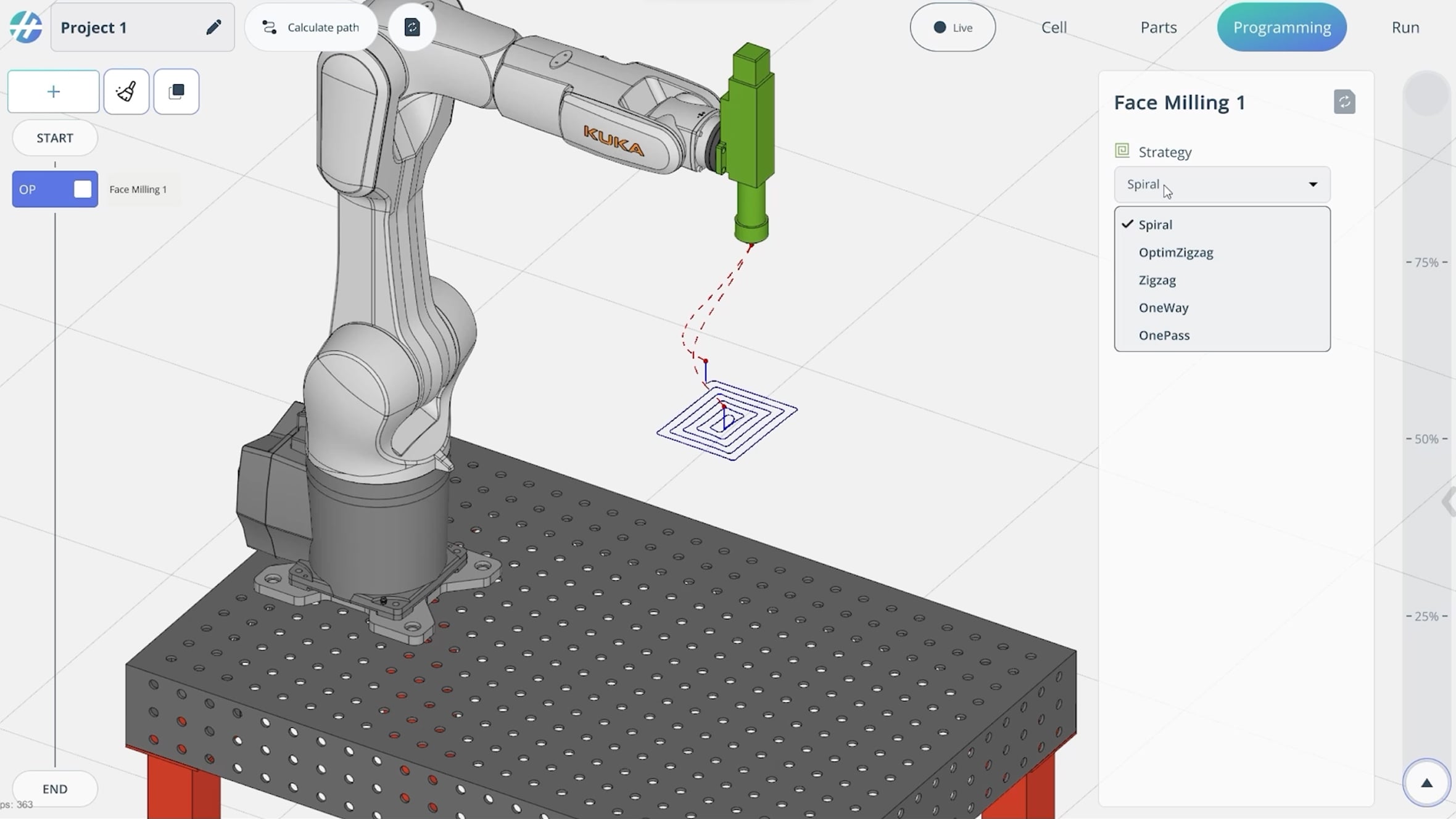 - Elimina rutinas complejas del teach pendant (péndulo de programación) — los flujos de trabajo completos se pueden diseñar con una lógica simple de arrastrar y soltar (drag-and-drop).