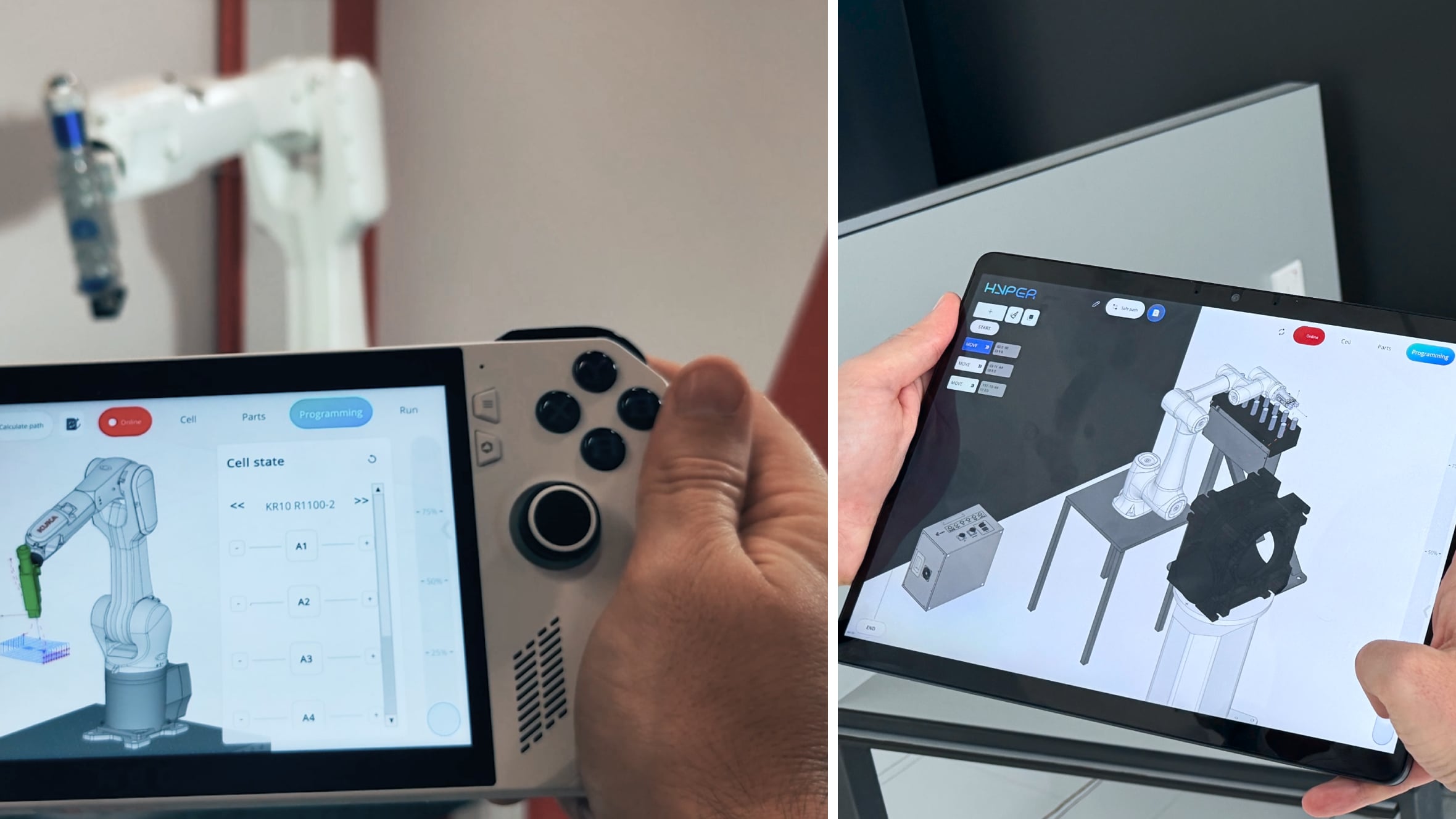 - Permite el ajuste fino, las pruebas y la ejecución de proyectos directamente junto al robot real, sin pérdida de datos ni de tiempo.