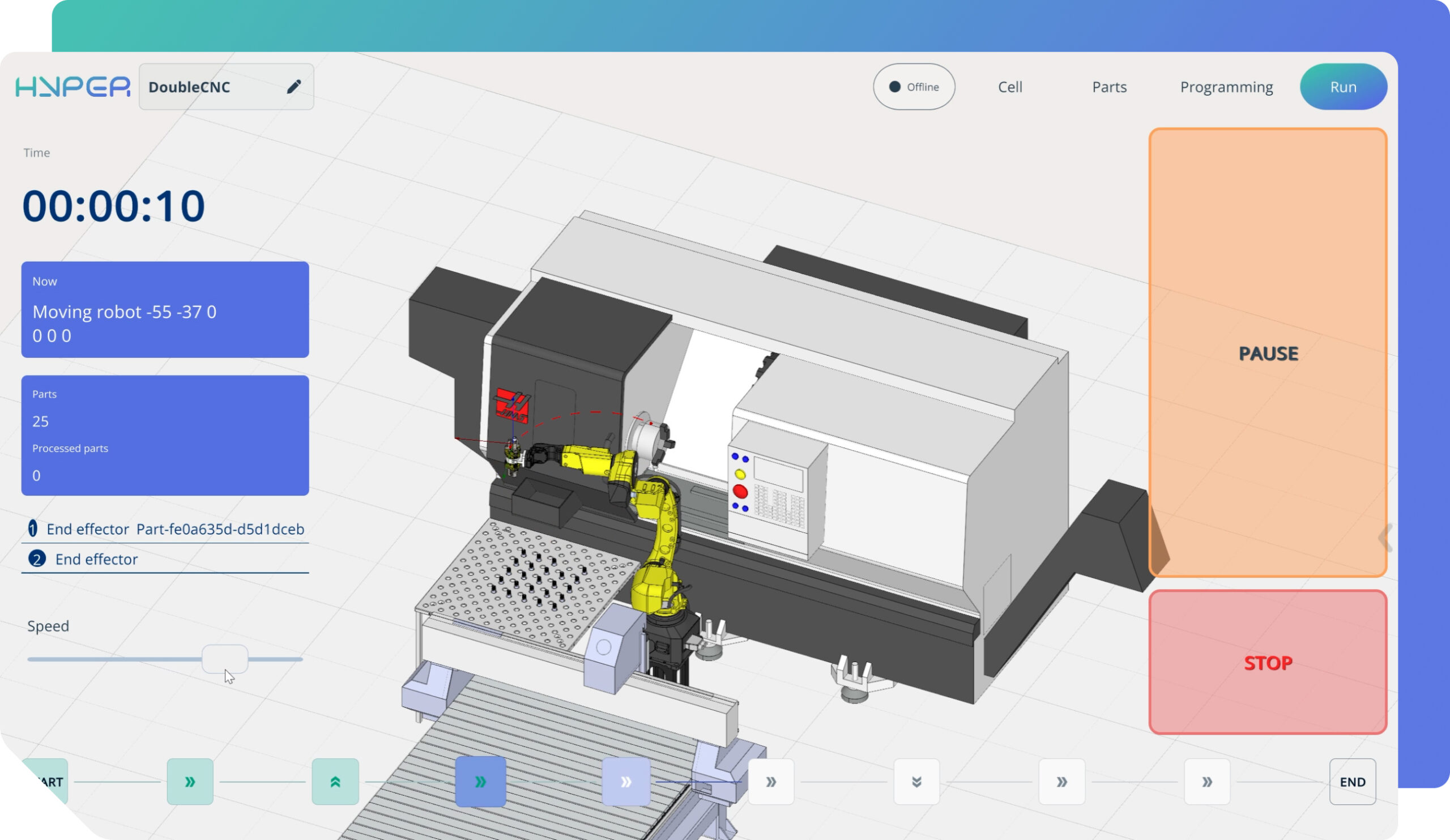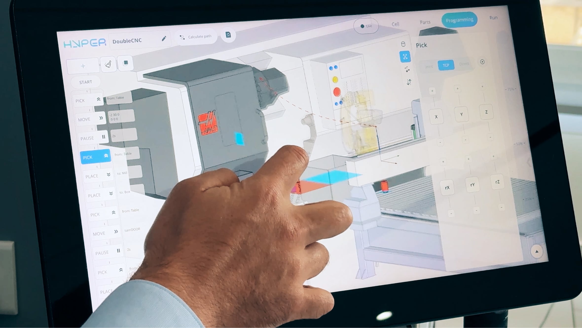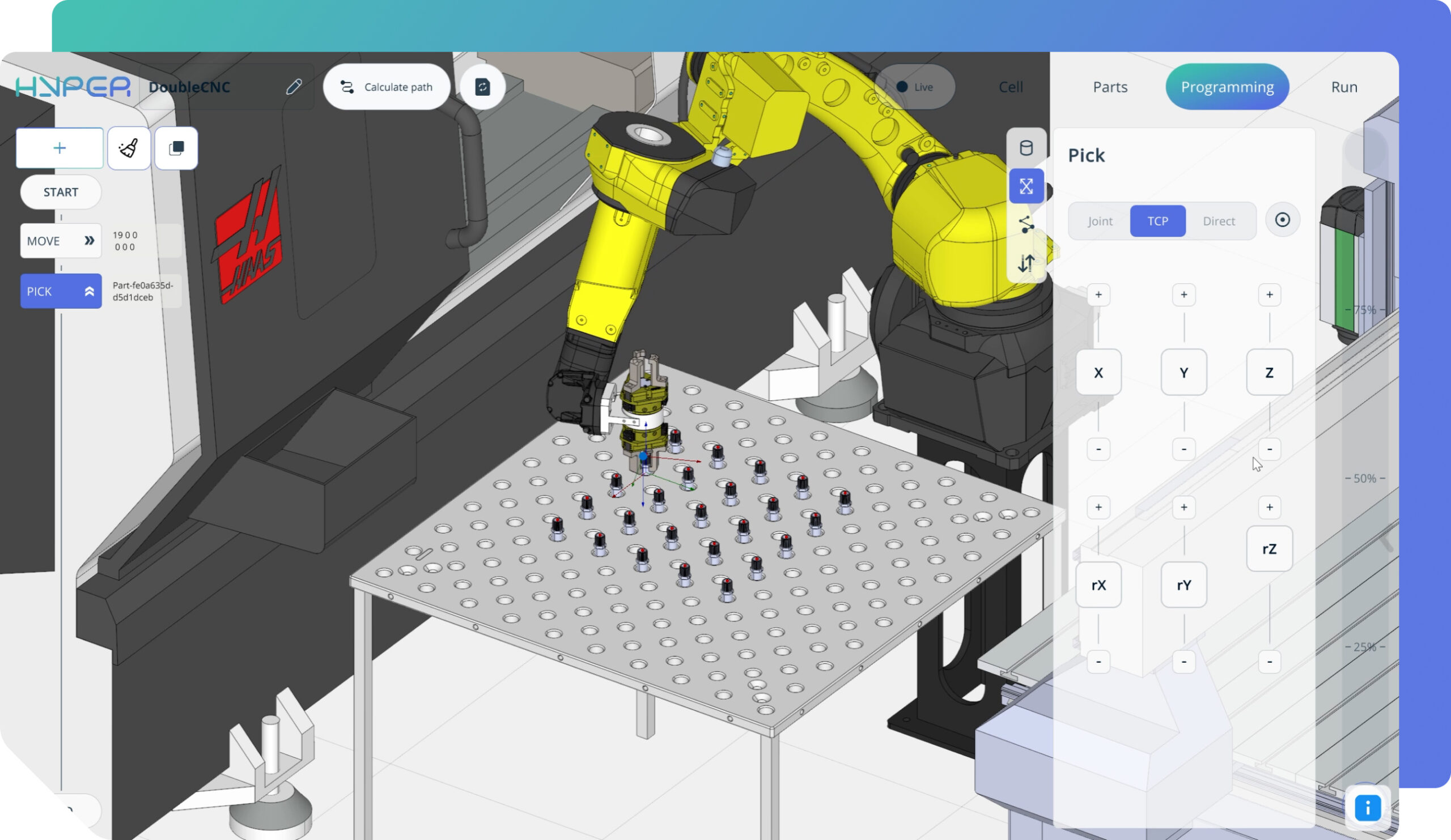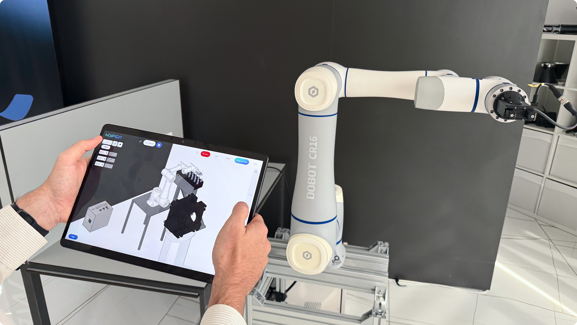 ENCY Hyper mantiene al usuario conectado con el robot real, permitiendo que el programa se ejecute y se perfeccione simultáneamente. En términos sencillos, la plataforma se conecta al controlador del robot en línea, lo que permite al ingeniero probar y ajustar los movimientos directamente en el robot real mientras observa los resultados tanto en el modelo virtual como en la celda física.