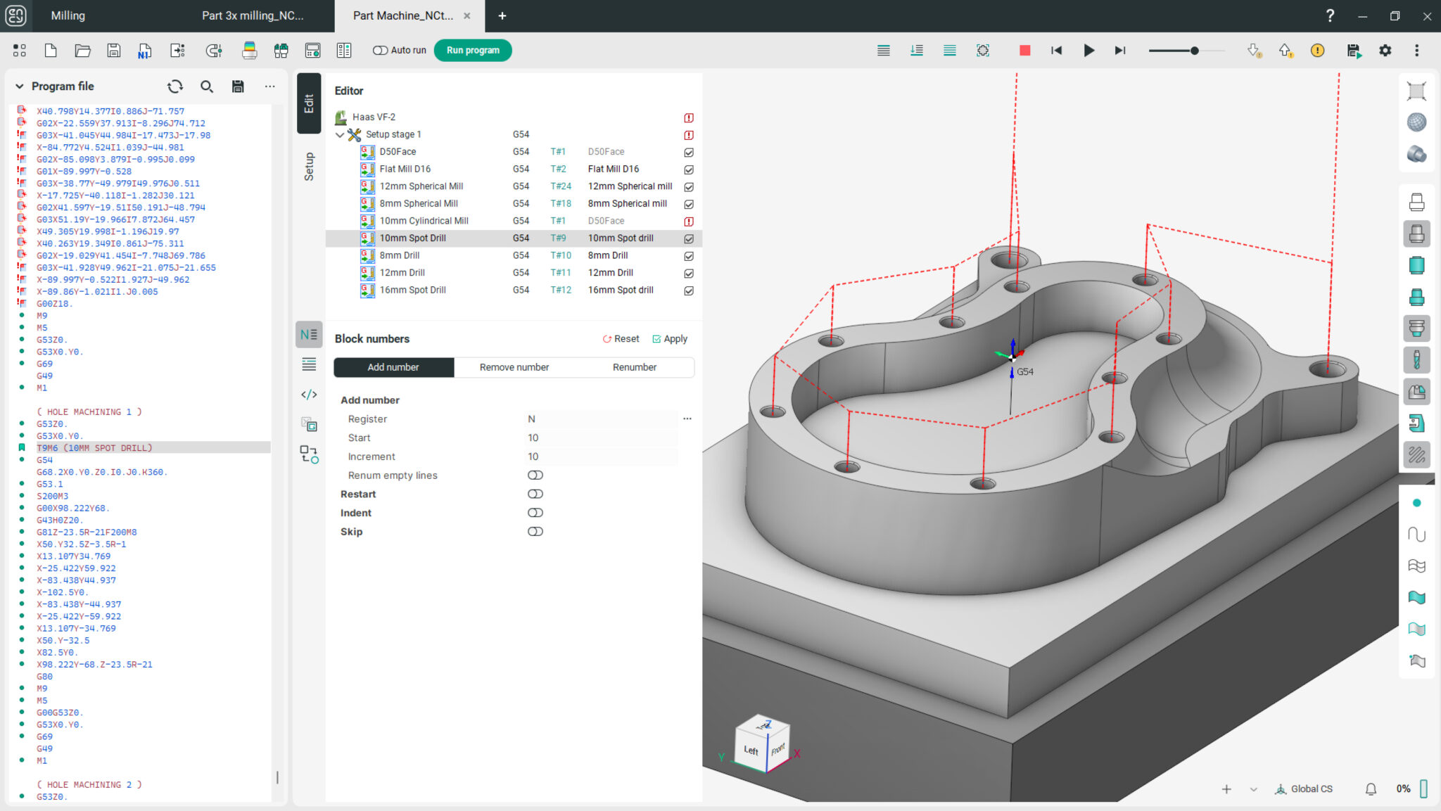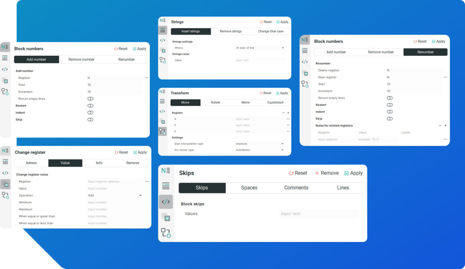 Herramienta de edición directa de código NC con estándares de la industria, que incluye funciones completas como numeración y renumeración, inserción y eliminación de cadenas, y cambios de mayúsculas y minúsculas. Permite omitir bloques, líneas, espacios y comentarios con facilidad. Además, ofrece capacidades avanzadas como cambios de dirección y valor de registros, así como herramientas de transformación de trayectorias, incluyendo mover, rotar, espejar y desplazamiento equidistante.